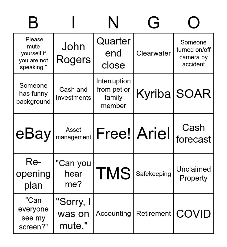This bingo card has a free space and 24 words: "Can you hear me?, "Sorry, I was on mute.", Interruption from pet or family member, "Can everyone see my screen?", Someone turned on/off camera by accident, "Please mute yourself if you are not speaking.", Someone has funny background, John Rogers, Ariel, TMS, Kyriba, eBay, Safekeeping, Unclaimed Property, Cash and Investments, Retirement, Cash forecast, Quarter end close, SOAR, Asset management, COVID, Re-opening plan, Clearwater and Accounting.