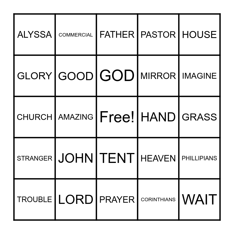 This bingo card has a free space and 31 words: PRAYER, BIBLE, AMAZING, GRACE, ALYSSA, FATHER, GOOD, HEAVEN, HAND, CORINTHIANS, GRASS, WAIT, MORE, RESPECT, IMAGINE, ALIEN, PHILLIPIANS, JOHN, STRANGER, TENT, HOUSE, JOB, TROUBLE, COMMERCIAL, MIRROR, GLORY, PASTOR, CHURCH, LORD, GOD and DAD.