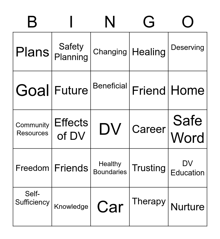 This bingo card has a free space and 26 words: Healthy Boundaries, Therapy, Beneficial, Knowledge, Deserving, Plans, Goal, Safety Planning, Safe Word, Trusting, Friend, Community Resources, DV Education, Self-Sufficiency, Effects of DV, Effects of DV on Children, Healing, Freedom, Changing, Nurture, Home, Car, Career, Friends, Future and Expression.