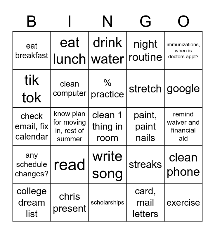 This bingo card has a free space and 24 words: read, chris present, % practice, college dream list, immunizations, when is doctors appt?, eat breakfast, tik tok, eat lunch, paint, paint nails, write song, stretch, check email, fix calendar, streaks, clean phone, clean computer, card, mail letters, remind waiver and financial aid, drink water, google, know plan for moving in, rest of summer, exercise, any schedule changes?, night routine and scholarships.