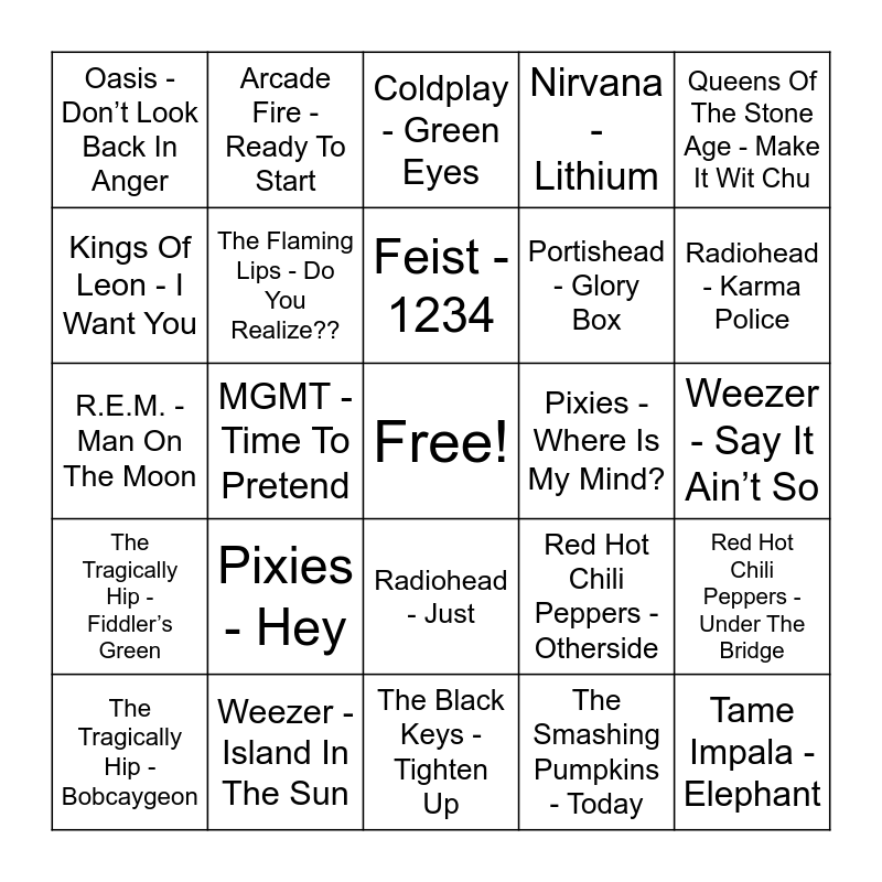 This bingo card has a free space and 36 words: The White Stripes - Hardest Button To Button, Modest Mouse - The World At Large, Arctic Monkeys - Riot Van, The Flaming Lips - Do You Realize??, Red Hot Chili Peppers - Otherside, The Tragically Hip - Fiddler’s Green, Feist - 1234, Alt-J - Bloodflood, Queens Of The Stone Age - Make It Wit Chu, Weezer - Pork & Beans, MGMT - Time To Pretend, Nirvana - Lithium, Arcade Fire - Rebellion (Lies), Pixies - Where Is My Mind?, Radiohead - Karma Police, Oasis - Don’t Look Back In Anger, Coldplay - Don’t Panic, Pixies - Hey, Tame Impala - Elephant, Coldplay - Green Eyes, Weezer - Say It Ain’t So, Red Hot Chili Peppers - Under The Bridge, Weezer - Island In The Sun, The Tragically Hip - Bobcaygeon, The Black Keys - Tighten Up, Arcade Fire - Ready To Start, R.E.M. - Man On The Moon, The Tragically Hip - Wheat Kings, Portishead - Glory Box, Kings Of Leon - I Want You, Green Day - Longview, The Killers - All These Things That I’ve Done, The Smashing Pumpkins - Today, Radiohead - Just, The Strokes - Last Nite and Courtney Barnett - Dead Fox.