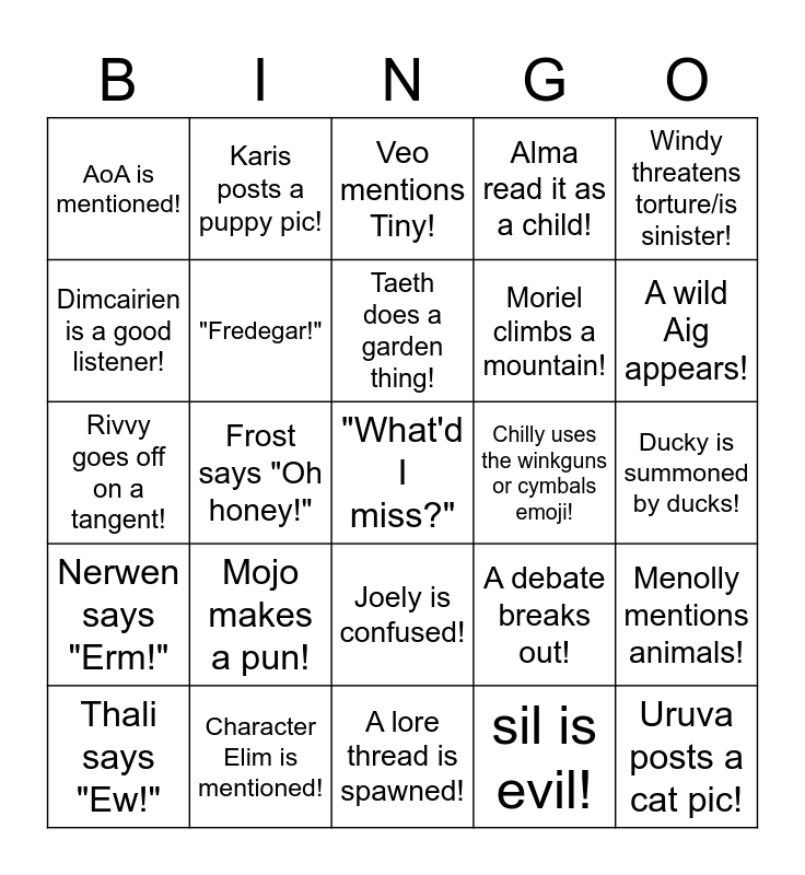 This bingo card has a free space and 24 words: Mojo makes a pun!, Character Elim is mentioned!, Taeth does a garden thing!, Thali says "Ew!", Windy threatens torture/is sinister!, AoA is mentioned!, Dimcairien is a good listener!, Karis posts a puppy pic!, Chilly uses the winkguns or cymbals emoji!, Joely is confused!, Moriel climbs a mountain!, Rivvy goes off on a tangent!, A debate breaks out!, Menolly mentions animals!, "Fredegar!", sil is evil!, Ducky is summoned by ducks!, Veo mentions Tiny!, A wild Aig appears!, Frost says "Oh honey!", Uruva posts a cat pic!, Nerwen says "Erm!", Alma read it as a child! and A lore thread is spawned!.