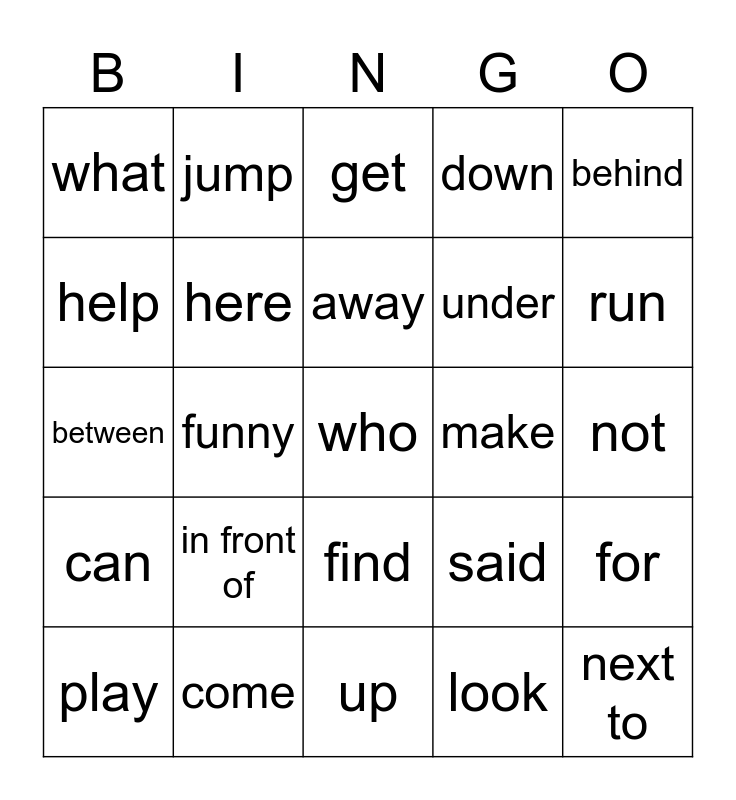 This bingo card has a free space and 24 words: in front of, come, away, play, behind, what, help, jump, make, find, under, between, said, for, here, look, not, get, run, funny, next to, can, down and up.