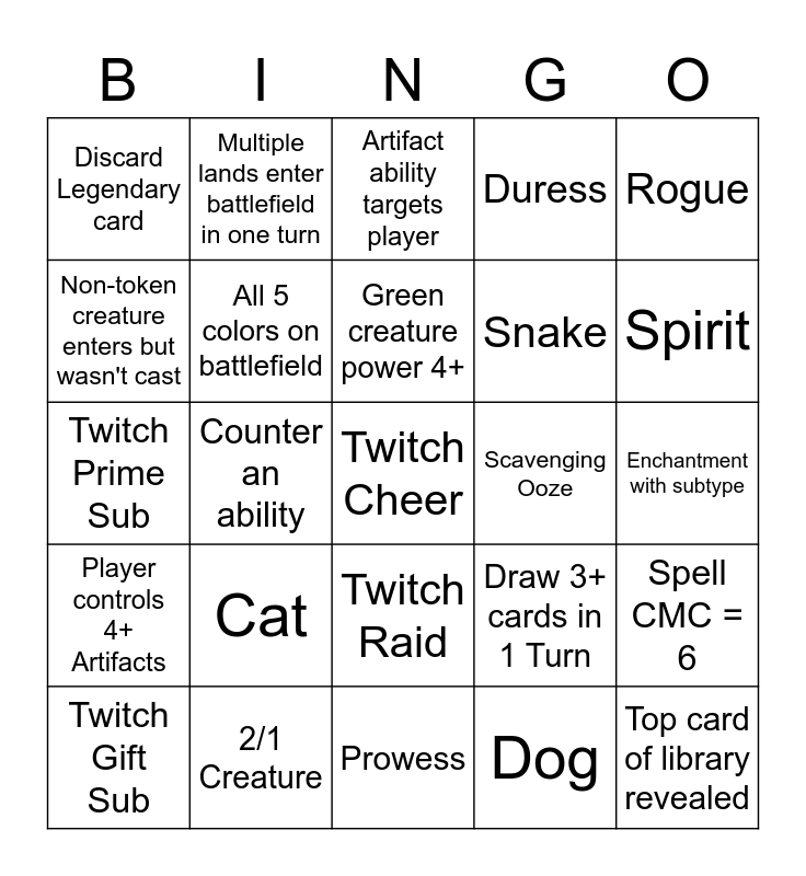 This bingo card has 25 words: Cat, Prowess, Green creature power 4+, Twitch Gift Sub, Rogue, Discard Legendary card, Non-token creature enters but wasn't cast, Multiple lands enter battlefield in one turn, Scavenging Ooze, Twitch Raid, Snake, Twitch Prime Sub, Draw 3+ cards in 1 Turn, Spell CMC = 6, All 5 colors on battlefield, Top card of library revealed, Enchantment with subtype, Artifact ability targets player, Spirit, Counter an ability, Twitch Cheer, 2/1 Creature, Player controls 4+ Artifacts, Duress and Dog.