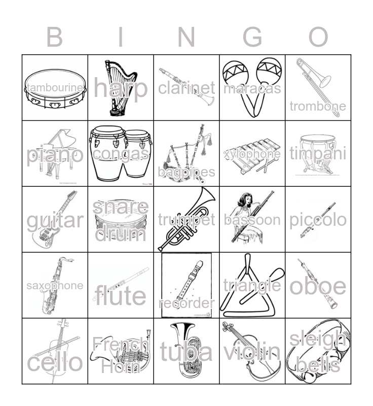 This bingo card has 24 images, a free space and 24 words: flute, French Horn, bagpipes, cello, trombone, tambourine, piano, harp, bassoon, recorder, xylophone, guitar, triangle, oboe, congas, violin, piccolo, clarinet, timpani, snare drum, sleigh bells, saxophone, maracas and tuba.
