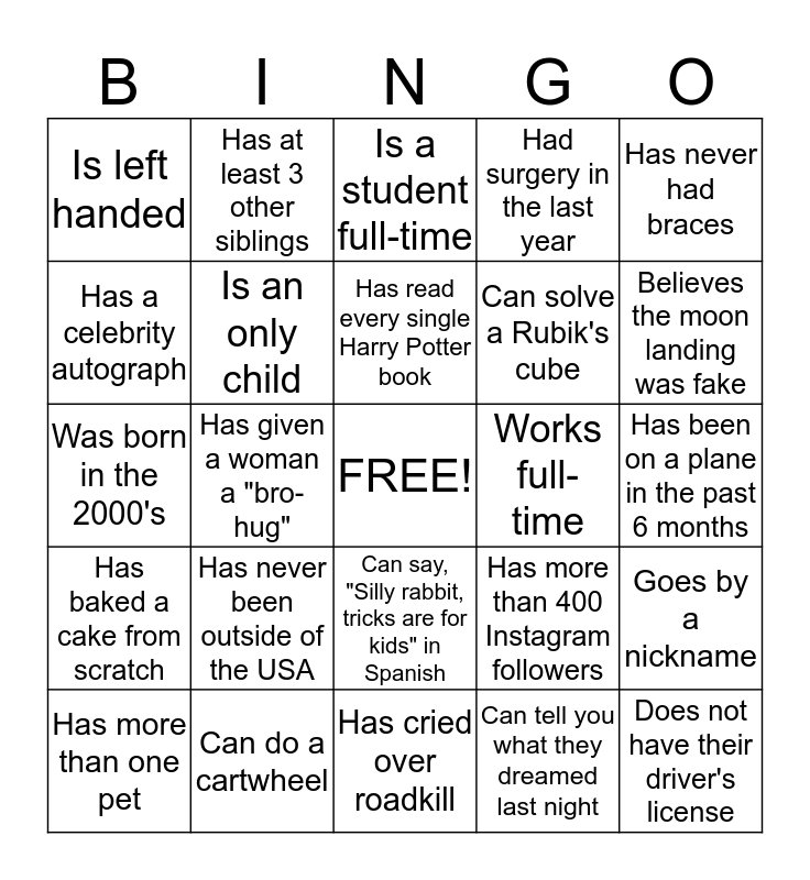 This bingo card has a free space and 24 words: Has never been outside of the USA, Can do a cartwheel, Has read every single Harry Potter book, Has more than one pet, Has never had braces, Is left handed, Has a celebrity autograph, Has at least 3 other siblings, Works full-time, Can say, "Silly rabbit, tricks are for kids" in Spanish, Can solve a Rubik's cube, Was born in the 2000's, Has more than 400 Instagram followers, Goes by a nickname, Is an only child, Can tell you what they dreamed last night, Has been on a plane in the past 6 months, Is a student full-time, Believes the moon landing was fake, Has given a woman a "bro-hug", Does not have their driver's license, Has baked a cake from scratch, Had surgery in the last year and Has cried over roadkill.
