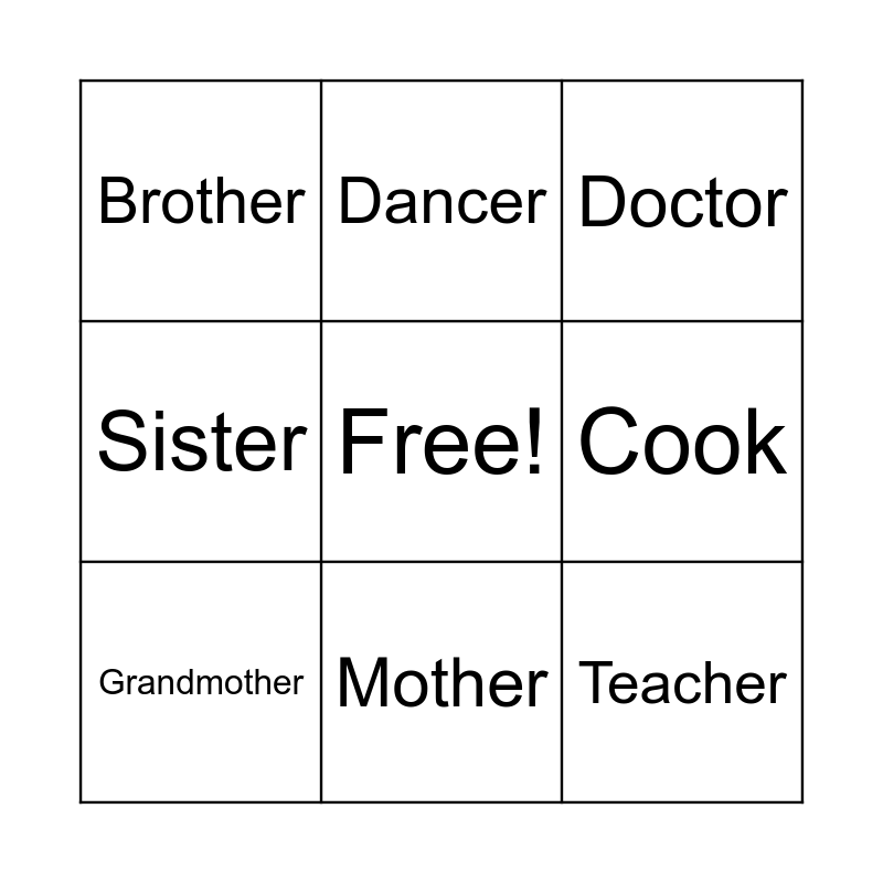 This bingo card has a free space and 12 words: Firefighter, Singer, Teacher, Cook, Dancer, Doctor, Mother, Father, Brother, Sister, Grandmother and Grandfather.