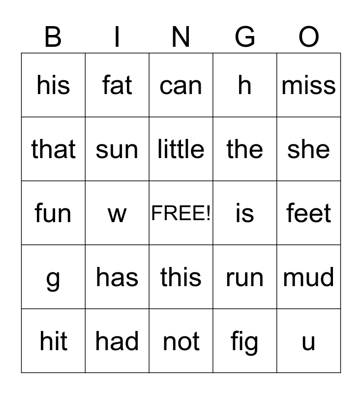 This bingo card has a free space and 24 words: has, had, little, hit, miss, his, that, fat, is, this, the, fun, run, mud, sun, fig, feet, can, she, w, u, g, h and not.