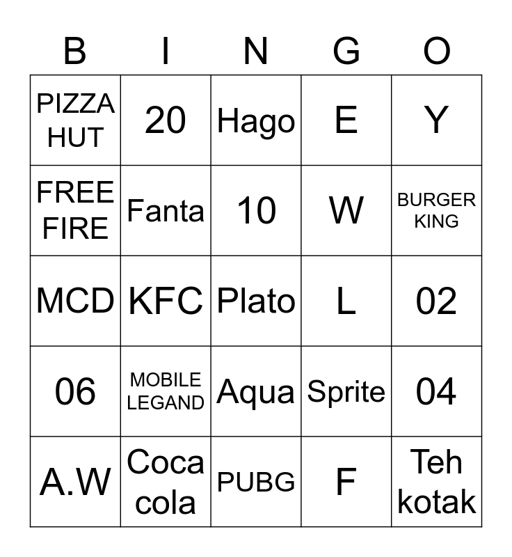 This bingo card has a free space and 24 words: MOBILE LEGAND, Coca cola, 10, A.W, Y, PIZZA HUT, FREE FIRE, 20, L, Aqua, W, MCD, Sprite, 04, Fanta, F, 02, Hago, BURGER KING, KFC, Teh kotak, 06, E and PUBG.