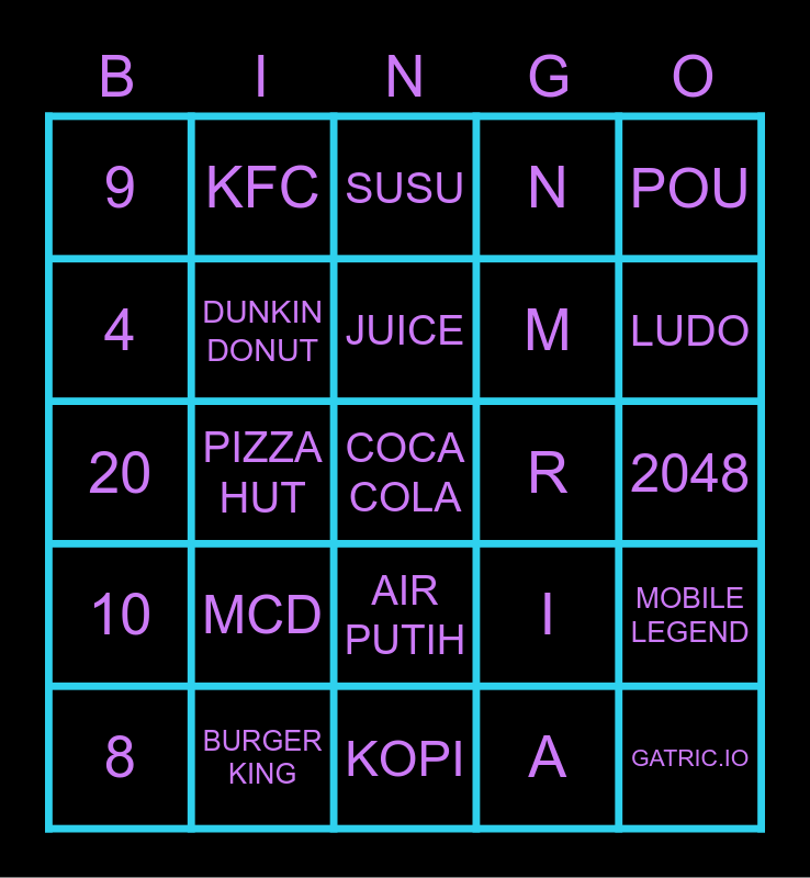 This bingo card has a free space and 24 words: 8, MCD, JUICE, A, POU, 9, KFC, SUSU, R, 2048, 20, DUNKIN DONUT, I, MOBILE LEGEND, 4, BURGER KING, KOPI, N, LUDO, 10, PIZZA HUT, AIR PUTIH, M and GATRIC.IO.
