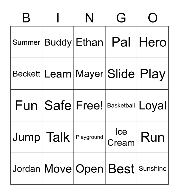 This bingo card has a free space and 74 words: Ivan, Ursula, Ethan, Brooklynn, Harmony, Elliott, Noah, Jasmyne, Jordan, Leif, Mellow, Ari, Mayer, Beckett, Parker, Safe, Friend, Play, Jodi, Fun, Learn, Buddy, Pal, Tennis, Sunshine, Check in, Talent, Fort, Magdalena, Celebrate, Hero, Camp, Care, Help, Maggie, Best, Love, Share, Understand, Listen, Open, Move, Magic, Hug, Support, Summer, Laugh, Talk, Honest, Trustworthy, Accepting, Entertain, Loyal, Dependable, Lansing, Parks, Playground, Swim, Bike, Run, Slide, Swing, Jump, Baseball, Basketball, Volleyball, Football, Soccer, Ice Cream, Healthy, Fruit, Vegetable, Snack and Yoga.