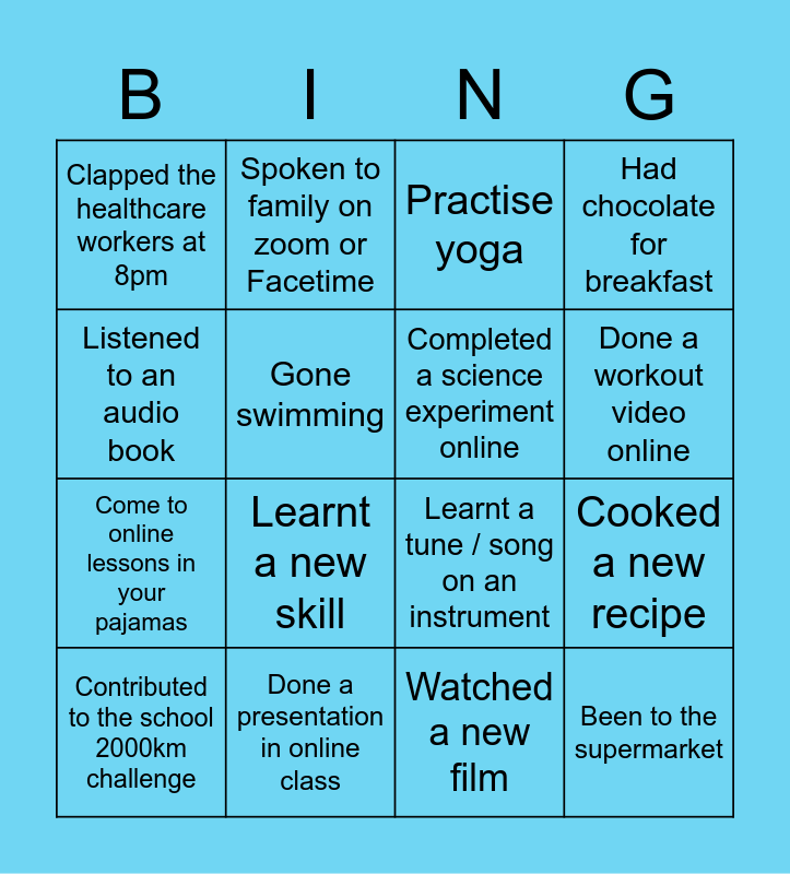 This bingo card has 16 words: Done a presentation in online class, Cooked a new recipe, Practise yoga, Clapped the healthcare workers at 8pm, Come to online lessons in your pajamas, Spoken to family on zoom or Facetime, Learnt a tune / song on an instrument, Watched a new film, Listened to an audio book, Gone swimming, Contributed to the school 2000km challenge, Had chocolate for breakfast, Learnt a new skill, Done a workout video online, Completed a science experiment online and Been to the supermarket.