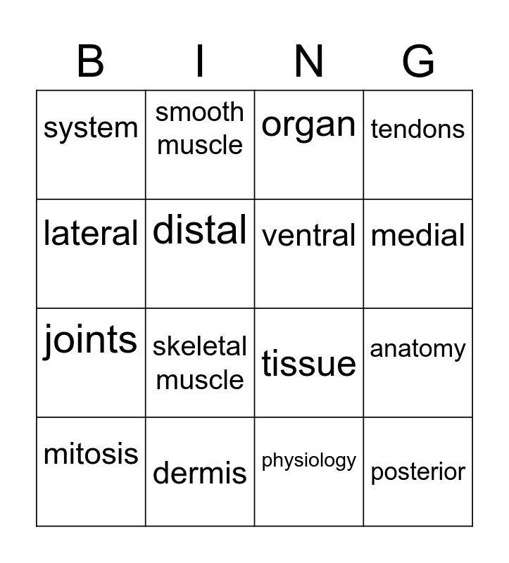 This bingo card has 16 words: dermis, anatomy, organ, system, joints, smooth muscle, tissue, physiology, lateral, distal, mitosis, tendons, skeletal muscle, medial, ventral and posterior.