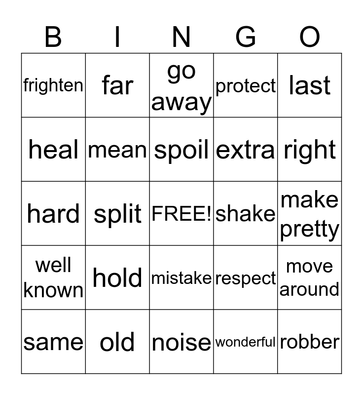 This bingo card has a free space and 24 words: hold, old, spoil, same, last, frighten, heal, far, shake, mistake, extra, hard, respect, move around, mean, wonderful, make pretty, go away, right, split, robber, well known, protect and noise.