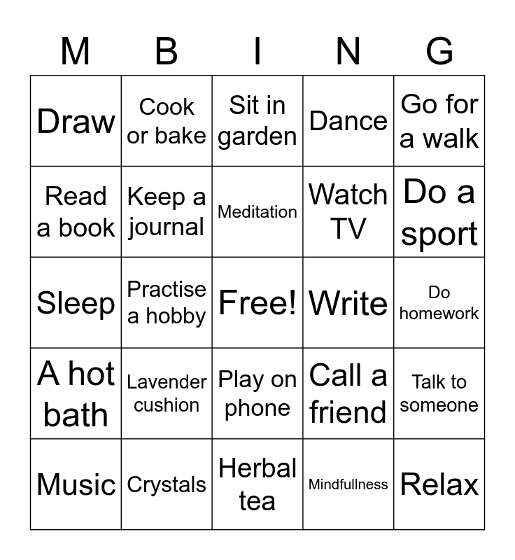 This bingo card has a free space and 25 words: Lavender cushion, Herbal tea, Meditation, Music, Go for a walk, Draw, Read a book, Cook or bake, Write, Play on phone, Watch TV, Sleep, Call a friend, Talk to someone, Keep a journal, Unplig from social media for a bit, Do homework, Sit in garden, Do a sport, Practise a hobby, Relax, Crystals, A hot bath, Dance and Mindfullness.