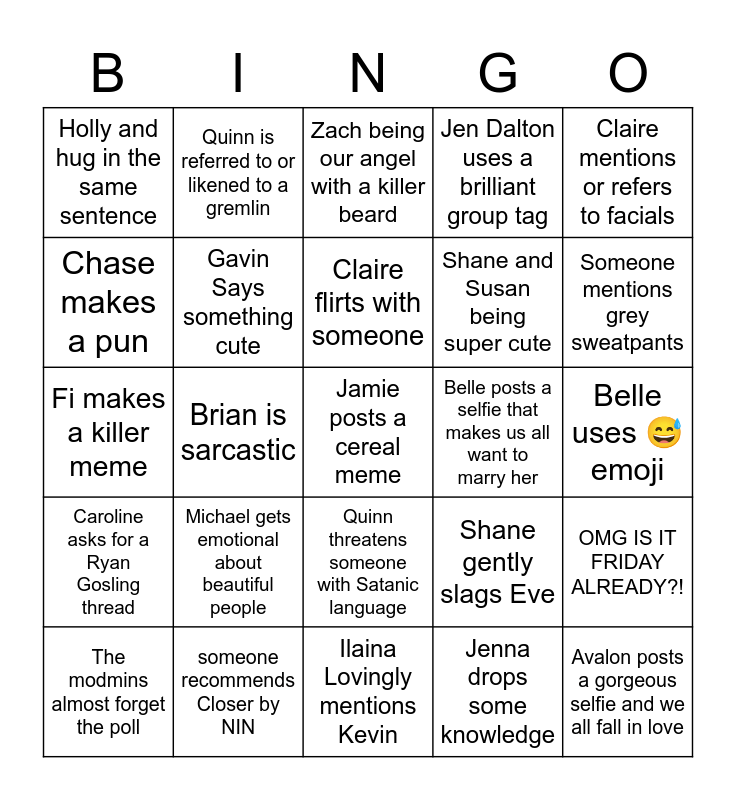 This bingo card has 25 words: Caroline asks for a Ryan Gosling thread, someone recommends Closer by NIN, Jamie posts a cereal meme, Jenna drops some knowledge, Claire mentions or refers to facials, Holly and hug in the same sentence, Quinn is referred to or likened to a gremlin, Zach being our angel with a killer beard, Belle posts a selfie that makes us all want to marry her, OMG IS IT FRIDAY ALREADY?!, Chase makes a pun, Gavin Says something cute, Ilaina Lovingly mentions Kevin, Shane gently slags Eve, Someone mentions grey sweatpants, The modmins almost forget the poll, Brian is sarcastic, Claire flirts with someone, Shane and Susan being super cute, Belle uses 😅 emoji, Fi makes a killer meme, Michael gets emotional about beautiful people, Quinn threatens someone with Satanic language, Jen Dalton uses a brilliant group tag and Avalon posts a gorgeous selfie and we all fall in love.
