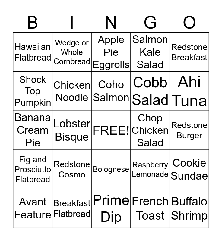 This bingo card has a free space and 24 words: Redstone Cosmo, Breakfast Flatbread, Coho Salmon, Avant Feature, Redstone Breakfast, Hawaiian Flatbread, Shock Top Pumpkin, Wedge or Whole Cornbread, Chop Chicken Salad, Bolognese, Cobb Salad, Banana Cream Pie, Raspberry Lemonade, Cookie Sundae, Chicken Noodle, French Toast, Redstone Burger, Apple Pie Eggrolls, Ahi Tuna, Lobster Bisque, Buffalo Shrimp, Fig and Prosciutto Flatbread, Salmon Kale Salad and Prime Dip.