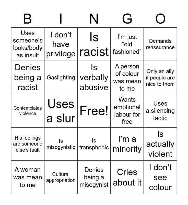 This bingo card has a free space and 24 words: Is misogynistic, Cultural appropriation, Is verbally abusive, A woman was mean to me, Demands reassurance, Uses someone’s looks/body as insult, Denies being a racist, I don’t have privilege, Wants emotional labour for free, Is transphobic, A person of colour was mean to me, Contemplates violence, I’m a minority, Is actually violent, Gaslighting, Cries about it, Uses a.silencing tactic, Is racist, Only an ally if people are nice to them, Uses a slur, I don’t see colour, His feelings are someone else’s fault, I’m just “old fashioned” and Denies being a misogynist.