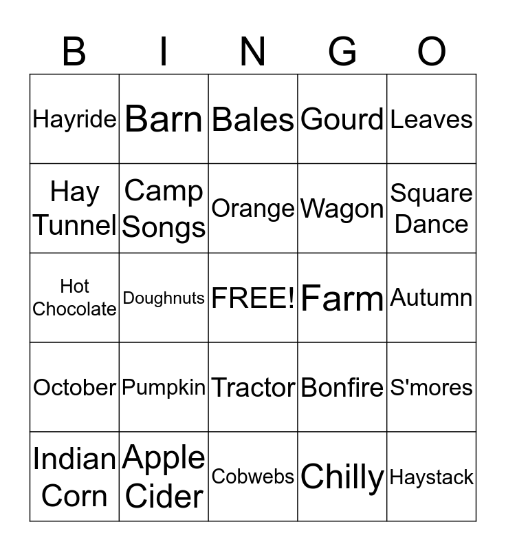 This bingo card has a free space and 24 words: Pumpkin, Apple Cider, Orange, Indian Corn, Leaves, Hayride, Hay Tunnel, Barn, Farm, Tractor, Wagon, Hot Chocolate, Bonfire, S'mores, Camp Songs, Chilly, Autumn, Bales, Square Dance, Doughnuts, Haystack, October, Gourd and Cobwebs.