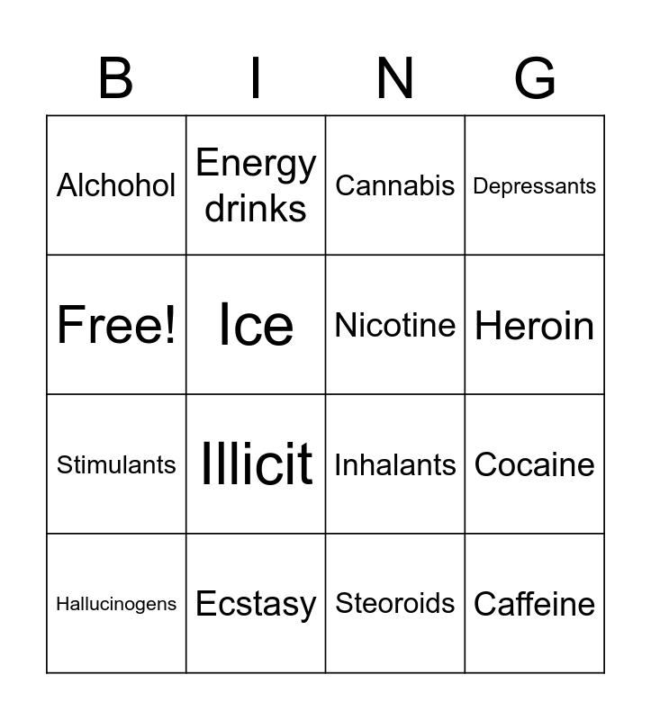 This bingo card has 16 words: Ecstasy, Cocaine, Cannabis, Alchohol, Stimulants, Energy drinks, Inhalants, Steoroids, Free!, Ice, Hallucinogens, Depressants, Illicit, Heroin, Nicotine and Caffeine.