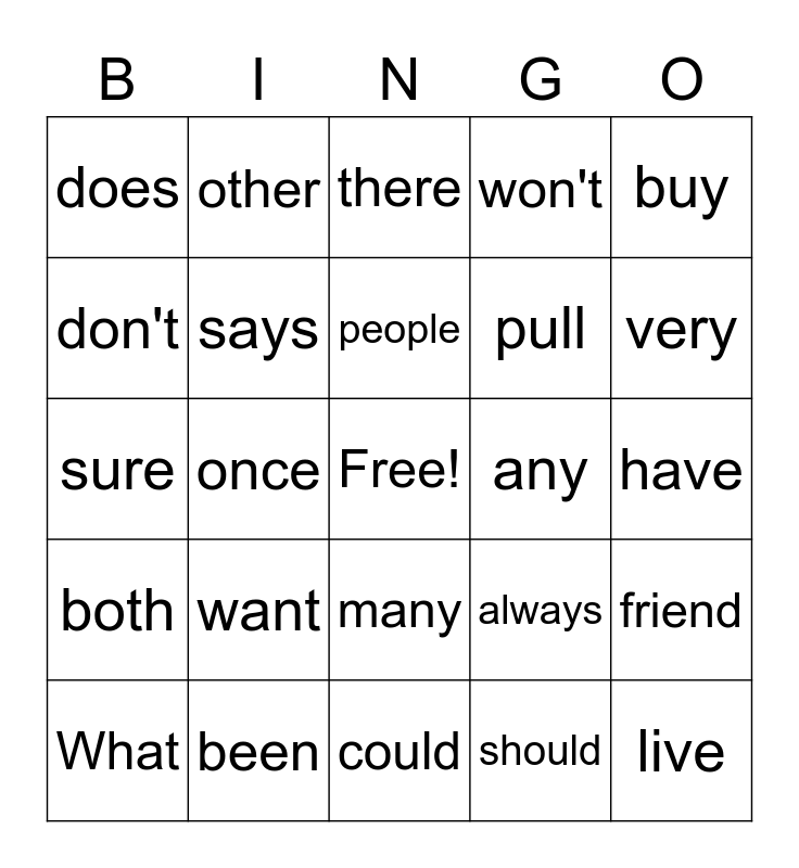 This bingo card has a free space and 29 words: What, said, once, goes, does, there, says, want, any, been, have, live, could, should, very, again, many, both, buy, sure, always, would, pull, don't, won't, other, friend, people and build.