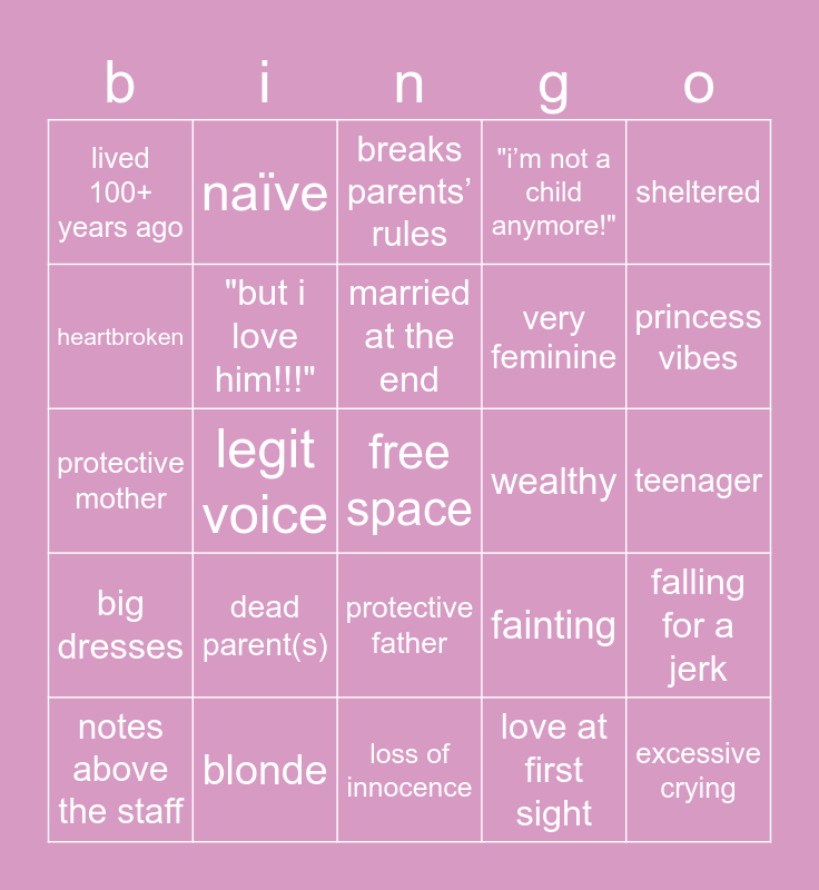 This bingo card has a free space and 24 words: notes above the staff, dead parent(s), married at the end, love at first sight, sheltered, lived 100+ years ago, naïve, breaks parents’ rules, wealthy, teenager, protective mother, "but i love him!!!", fainting, falling for a jerk, heartbroken, blonde, loss of innocence, "i’m not a child anymore!", princess vibes, big dresses, legit voice, protective father, very feminine and excessive crying.