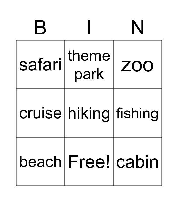 This bingo card has 9 words: beach, zoo, theme park, cruise, safari, fishing, hiking, cabin and Free!.
