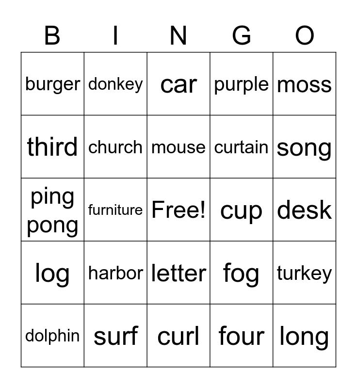 This bingo card has a free space and 24 words: dolphin, harbor, mouse, four, moss, burger, donkey, car, cup, desk, ping pong, church, fog, turkey, third, surf, curl, purple, song, log, furniture, letter, curtain and long.