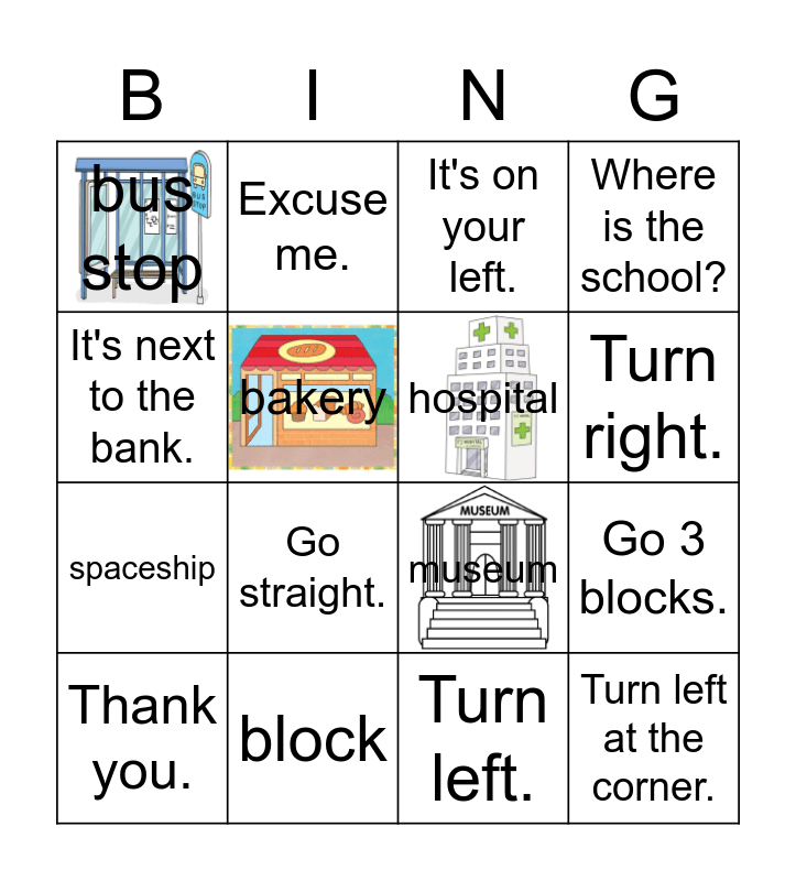 This bingo card has 8 images and 24 words: building, park, Turn right., apartment, It's next to the bank., bus stop, bakery, Excuse me., block, school, spaceship, museum, It's on your right., hospital, Go 2 blocks., Turn left., It's on your left., Go straight., Go 3 blocks., Thank you., Go 1 block., Turn left at the corner., Where is the school? and Where is the park?.