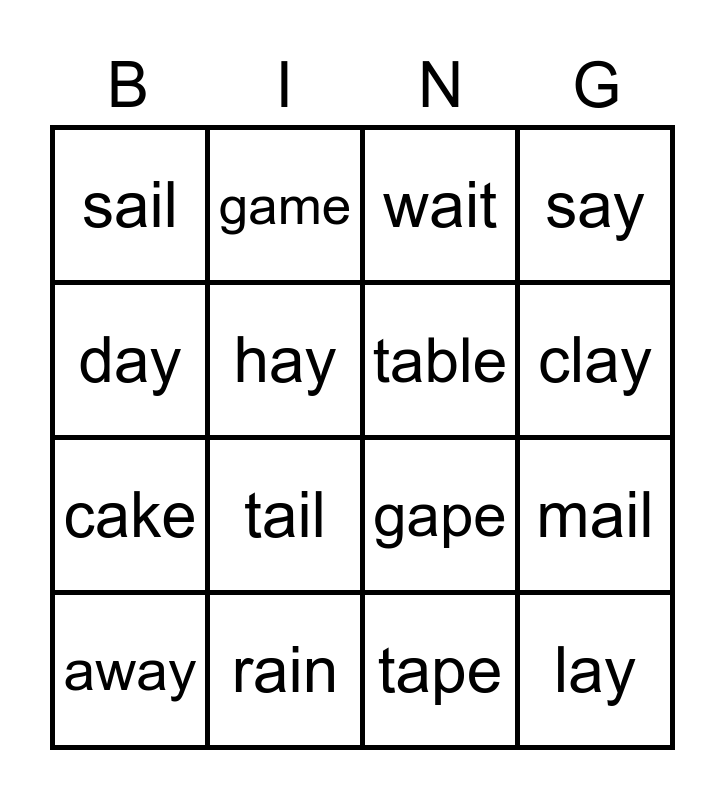 This bingo card has 16 words: rain, mail, wait, sail, cake, game, gape, tape, day, hay, away, say, tail, clay, table and lay.