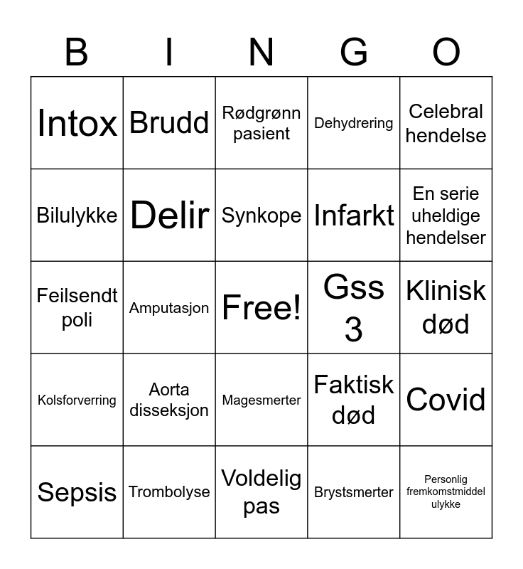 This bingo card has a free space and 26 words: Magesmerter, Brystsmerter, Synkope, Trombolyse, Celebral hendelse, Intox, Bilulykke, Brudd, Klinisk død, Faktisk død, Infarkt, Feilsendt poli, Covid, Sepsis, Amputasjon, Mani, Dehydrering, Kolsforverring, Rødgrønn pasient, Personlig fremkomstmiddel ulykke, En serie uheldige hendelser, Voldelig pas, Gss 3, Aorta disseksjon, Delir and Fylleskade.