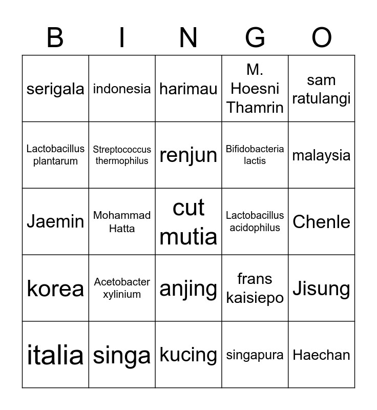This bingo card has a free space and 24 words: Acetobacter xylinium, singa, renjun, italia, sam ratulangi, serigala, Lactobacillus plantarum, indonesia, Lactobacillus acidophilus, anjing, Bifidobacteria lactis, Jaemin, frans kaisiepo, Jisung, Streptococcus thermophilus, singapura, Chenle, harimau, malaysia, Mohammad Hatta, Haechan, korea, M. Hoesni Thamrin and kucing.