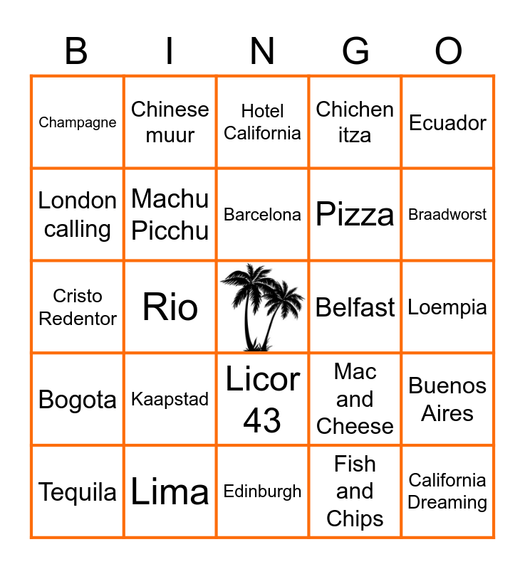 This bingo card has a free space and 75 words: Africa, Anton aus Tirol, Hotel California, Get spanish, America, Havana, We are going to Ibiza, Brazil (la la la), Born in the USA, Liefs uit London, Big in Japan, Mexico, Barcelona, London calling, Parijs, Rio, New York, California Dreaming, België, Ecuador, Taj Mahal, Cristo Redentor, Machu Picchu, Chinese muur, Chichen itza, Colosseum, Petra, Paella, Schnitzel, Knäckebröd, Shakshuka, Gyros, Pad Thai, Mac and Cheese, Braadworst, Pizza, Noorse Zalm, Rendang, Loempia, Fish and Chips, Braai, Brie, Pasteis de nata, Dumpling, Baklava, Wodka, Tequila, Champagne, Port, Raki, Rum, Licor 43, Sake, Gin, Absint, Caïro, Nairobi, Jeruzalem, Tokio, Koeweit, Kaapstad, Bangkok, Seoel, Sofia, Helsinki, Belfast, Ottawa, Canberra, Wellington, Buenos Aires, Bogota, Lima, Willemstad, Edinburgh and Islamabad.