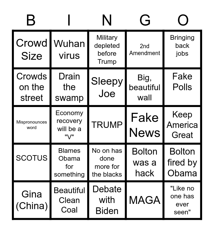This bingo card has a free space and 24 words: Blames Obama for something, Beautiful Clean Coal, Sleepy Joe, Gina (China), Bringing back jobs, Crowd Size, Crowds on the street, Wuhan virus, Fake News, No on has done more for the blacks, Big, beautiful wall, Mispronounces word, Bolton was a hack, Bolton fired by Obama, Drain the swamp, MAGA, Keep America Great, Military depleted before Trump, Fake Polls, Economy recovery will be a "V", "Like no one has ever seen", SCOTUS, 2nd Amendment and Debate with Biden.