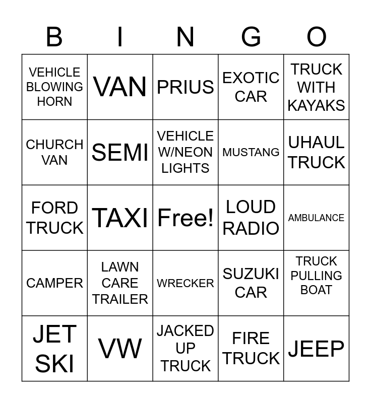 This bingo card has a free space and 37 words: MULTI COLORED CAR, BLK POLICE CAR, FIRE TRUCK, SEMI, TRUCK PULLING BOAT, LAWN CARE TRAILER, VEHICLE W/NEON LIGHTS, COMO TRUCK, TRUCK WITH KAYAKS, CONVERTABLE CORVETTE, TAXI, EXOTIC CAR, JEEP, AMBULANCE, CHURCH VAN, CAMPER, POLICE SUV, PRIUS, WRECKER, LOUD RADIO, VEHICLE BLOWING HORN, UHAUL TRUCK, JET SKI, JACKED UP TRUCK, MOTORCYCLE, FIRE TRUCK, VAN, WORK VAN, TESLA, RICER CAR, POLICE CAR, VW, FORD TRUCK, FIAT, SUZUKI CAR, MUSTANG and TESLA.