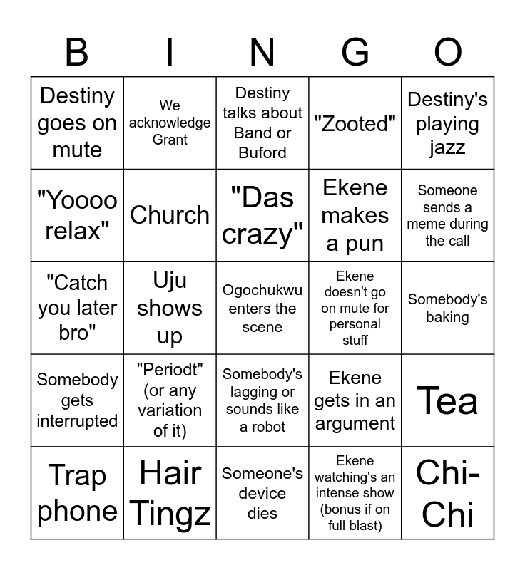 This bingo card has 31 words: Someone's device dies, Internet connection goes out, Uju shows up, Destiny playing a game, Destiny goes on mute, Destiny talks about Band or Buford, Church, Ekene gets in an argument, Ekene doesn't go on mute for personal stuff, Ekene watching's an intense show (bonus if on full blast), Somebody's baking, Ogochukwu enters the scene, Chi-Chi, The situation escalates really quickly, Someone sends a meme during the call, Somebody quotes a tik tok or tweet out of context, Tea, "Periodt" (or any variation of it), Somebody gets interrupted, Somebody's lagging or sounds like a robot, Destiny's playing jazz, The call goes past midnight (bonus points if there's silence for more than 10 minutes), Trap phone, We acknowledge Grant, Ekene makes a pun, "Yoooo relax", "Zooted", "Catch you later bro", Hair Tingz, "Das crazy" and Out of pocket.