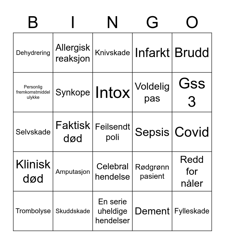 This bingo card has 39 words: Free!, Magesmerter, Brystsmerter, Synkope, Trombolyse, Celebral hendelse, Intox, Bilulykke, Brudd, Klinisk død, Faktisk død, Infarkt, Feilsendt poli, Covid, Sepsis, Amputasjon, Mani, Dehydrering, Kolsforverring, Rødgrønn pasient, Personlig fremkomstmiddel ulykke, En serie uheldige hendelser, Voldelig pas, Gss 3, Aorta disseksjon, Delir, Fylleskade, Skade med dyr involvert, Lungebetennelse (ikke covid), Allergisk reaksjon, Pas tar egen prøve (stikk), Pas river ut pvk, Knivskade, Skuddskade, Dement, Pas med overdrevet idrettstøy, Redd for nåler, Selvskade and Pårørende kommer inn.