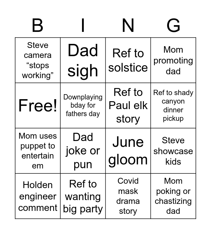 This bingo card has 16 words: Ref to wanting big party, Steve showcase kids, Ref to solstice, Steve camera “stops working”, Mom uses puppet to entertain em, Dad sigh, June gloom, Covid mask drama story, Free!, Downplaying bday for fathers day, Holden engineer comment, Mom promoting dad, Dad joke or pun, Ref to shady canyon dinner pickup, Ref to Paul elk story and Mom poking or chastizing dad.