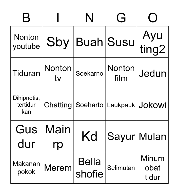 This bingo card has a free space and 24 words: Main rp, Merem, Soekarno, Makanan pokok, Ayu ting2, Nonton youtube, Tiduran, Sby, Laukpauk, Kd, Nonton film, Dihipnotis, tertidur kan, Sayur, Mulan, Nonton tv, Selimutan, Jokowi, Buah, Jedun, Chatting, Minum obat tidur, Gus dur, Susu and Bella shofie.
