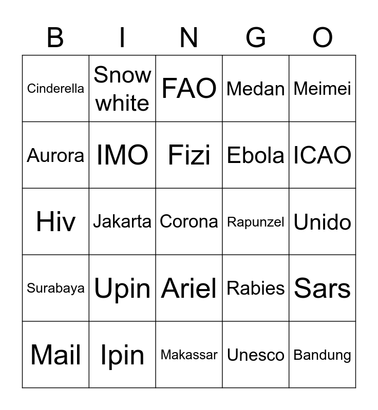 This bingo card has a free space and 24 words: Upin, Ipin, Fizi, Mail, Meimei, Cinderella, Aurora, Snow white, Rapunzel, Ariel, Ebola, Hiv, Rabies, Sars, IMO, Unesco, Unido, FAO, ICAO, Jakarta, Bandung, Surabaya, Medan and Makassar.