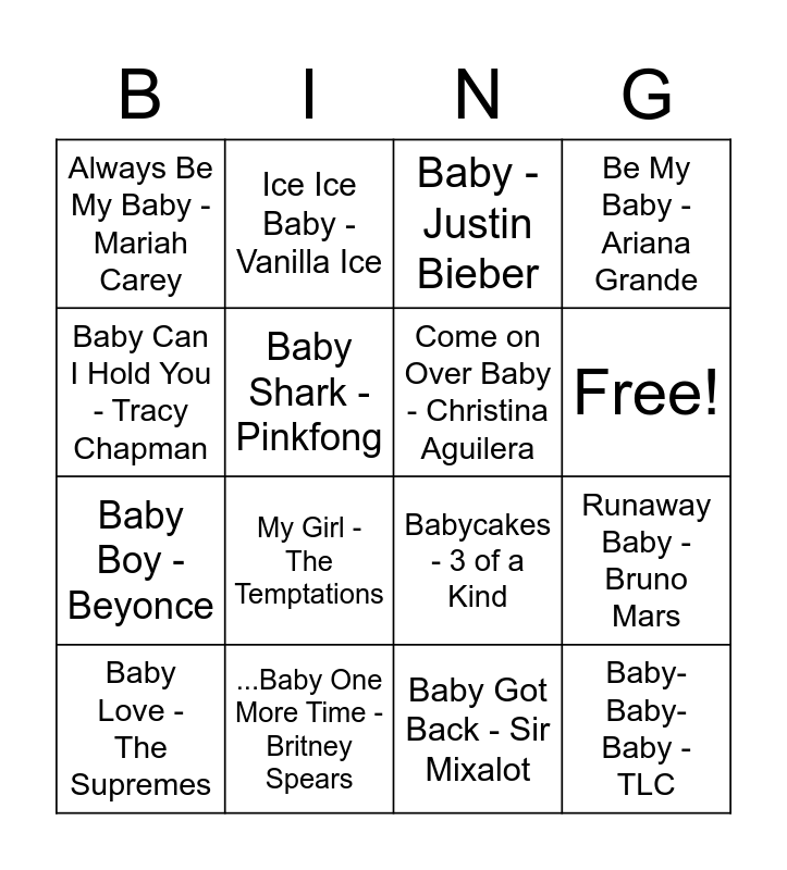 This bingo card has 17 words: Baby Got Back - Sir Mixalot, Baby Love - The Supremes, Baby - Justin Bieber, Always Be My Baby - Mariah Carey, My Girl - The Temptations, Be My Baby - Ariana Grande, Runaway Baby - Bruno Mars, Come on Over Baby - Christina Aguilera, Free!, Baby Shark - Pinkfong, ...Baby One More Time - Britney Spears, Babycakes - 3 of a Kind, Baby Can I Hold You - Tracy Chapman, Ice Ice Baby - Vanilla Ice, Baby Boy - Beyonce, Baby I'm Yours - Arctic Monkeys and Baby-Baby-Baby - TLC.