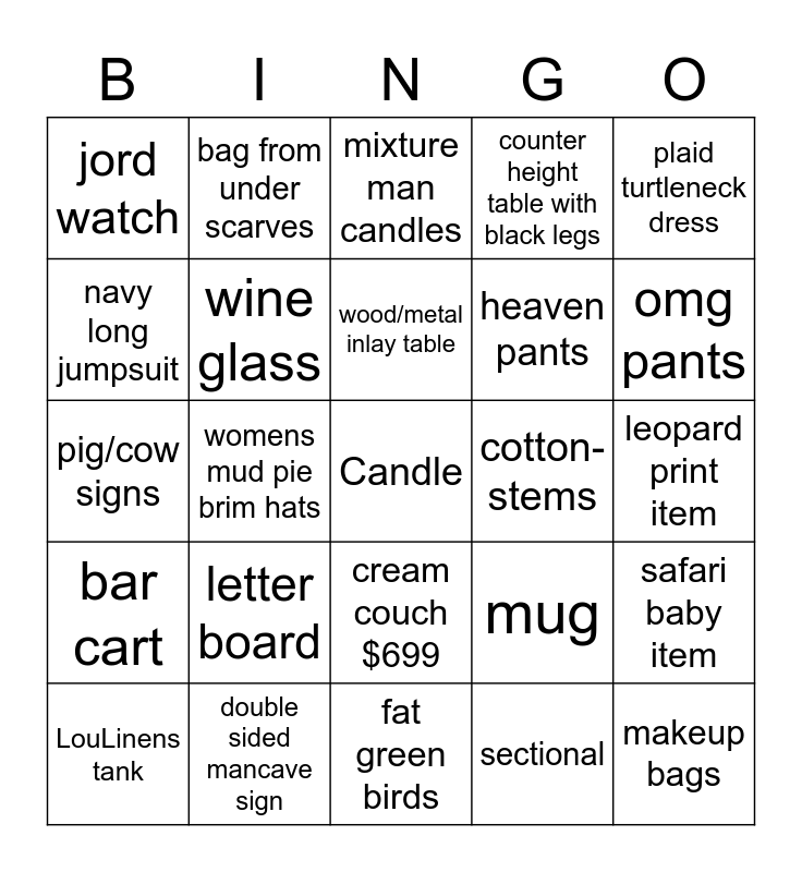 This bingo card has a free space and 24 words: letter board, double sided mancave sign, wood/metal inlay table, LouLinens tank, plaid turtleneck dress, jord watch, navy long jumpsuit, bag from under scarves, cotton-stems, cream couch $699, heaven pants, pig/cow signs, mug, safari baby item, wine glass, sectional, leopard print item, mixture man candles, omg pants, womens mud pie brim hats, makeup bags, bar cart, counter height table with black legs and fat green birds.