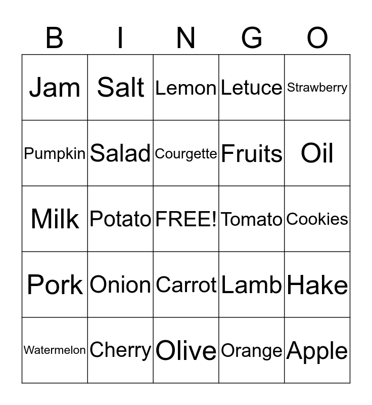 This bingo card has a free space and 44 words: Grape, Apple, Peach, Watermelon, Banana, Orange, Lemon, Pear, Strawberry, Cherry, Letuce, Tomato, Carrot, Onion, Garlic, Olive, Bread, Milk, Vinegar, Oil, Salt, Pepper, Butter, Jam, Chocolate, Cookies, Cereals, Beef, Lamb, Pork, Chicken, Hake, Mussels, Salmon, Potato, Peas, Cauliflower, Mushrooms, Courgette, Pumpkin, Fruits, Meat, Salad and Seafood.