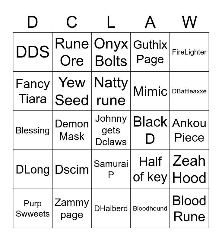 This bingo card has a free space and 24 words: Dscim, Zammy page, Natty rune, Purp Swweets, FireLighter, DDS, Fancy Tiara, Rune Ore, Black D, Samurai P, Mimic, Blessing, Half of key, Zeah Hood, Yew Seed, Bloodhound, Ankou Piece, Onyx Bolts, DBattleaxxe, Demon Mask, Blood Rune, DLong, Guthix Page and DHalberd.