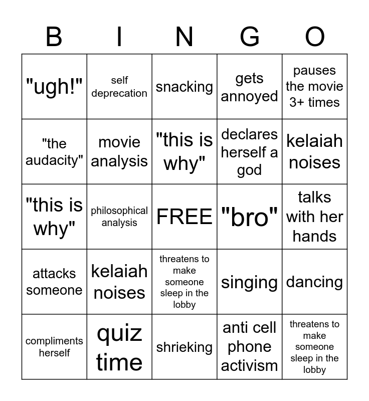 This bingo card has a free space and 48 words: gasps, threatens to make someone sleep in the lobby, attacks someone, shrieking, kelaiah noises, compliments herself, self deprecation, sarcasm, "the audacity", talks with her hands, movie analysis, gets annoyed, dancing, singing, snacking, mocks or mimics something, "this is why", "bro", quiz time, pauses the movie 3+ times, philosophical analysis, anti cell phone activism, "ugh!", declares herself a god, shrieking, kelaiah noises, compliments herself, gasps, threatens to make someone sleep in the lobby, attacks someone, self deprecation, sarcasm, "the audacity", "bro", quiz time, pauses the movie 3+ times, philosophical analysis, talks with her hands, movie analysis, gets annoyed, dancing, singing, snacking, mocks or mimics something, "this is why", anti cell phone activism, "ugh!" and declares herself a god.
