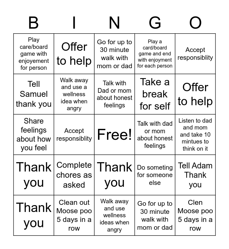 This bingo card has a free space and 26 words: Thank you, Go for up to 30 minute walk with mom or dad, Talk with Dad or mom about honest feelings, Clean out Moose poo 5 days in a row, Accept responsiblity, Play care/board game with enjoyement for person, Tell Samuel thank you, Offer to help, Listen to dad and mom and take 10 mintues to think on it, Do someting for someone else, Take a break for self, Share feelings about how you feel, Tell Adam Thank you, Thank you, Accept responsiblity, Complete chores as asked, Play a card/board game and end with enjoyment for each person, Thank you, Go for up to 30 minute walk with mom or dad, Clen Moose poo 5 days in a row, Offer to help, Walk away and use wellness ideas when angry, Talk with dad or mom about honest feelings, Complete chores as asked, Walk away and use a wellness idea when angry and Come back to dad or mom to discuss a situation that didn't go well.