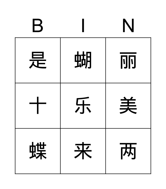 This bingo card has a free space and 8 words: 美, 丽, 蝴, 蝶, 是, 两, 十 and 来.