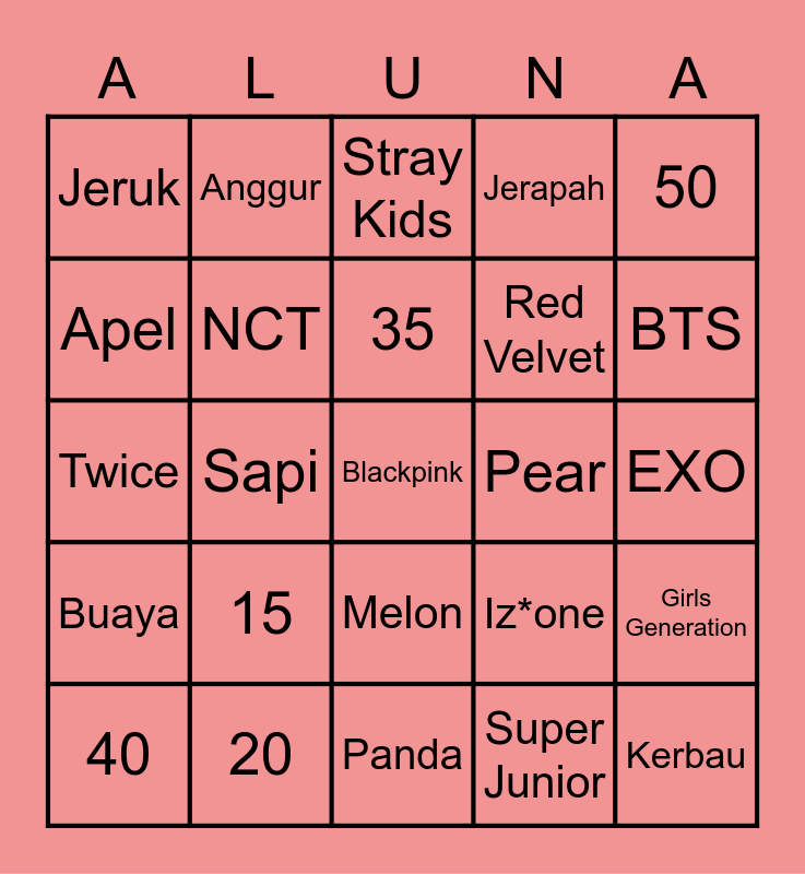 This bingo card has a free space and 24 words: 15, 20, 35, 40, 50, Jeruk, Apel, Anggur, Pear, Melon, Red Velvet, Twice, Iz*one, Girls Generation, NCT, Super Junior, EXO, Stray Kids, BTS, Sapi, Kerbau, Buaya, Jerapah and Panda.