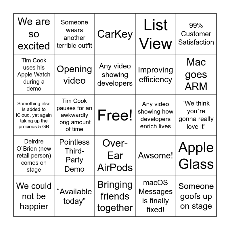 This bingo card has a free space and 102 words: “It`s the best X we`ve ever made.”, Celebrities on stage, 99% Customer Satisfaction, “We can`t wait to see what you do with it”, Apple original TV shows, Augmented Reality, Retail Stores, Amazing!, …ever!, App Store, iOS 14, Apple`s Crack Marketing Team takes a trip, A demo fails, New Wallpaper Management, Apple releases something that wasn`t in the rumors, iOS 14 gets Widgets, Deirdre O`Brien (new retail person) comes on stage, Awesome reveal video, Apple releases a First-Party wireless charger, Apple uses Neomorphism, Apple Game Controller, Talking about how AppStore ecosystem made half a trillion dollars in 2019, Overdramatic opening video, AirTags Released, New iMac, Mac goes ARM, List View, Pointless Third-Party Demo, New Apple TV, AirPower is mentioned, Someone wears another terrible outfit, CarKey, macOS 10.16 is actually good again, Apple releases random products before the event, HomePod Mini, Over-Ear AirPods, Someone claims to have invented something when they really didn`t, Tim Cook has an awkward pause…, Something else is added to iCloud, yet again taking up the precious 5 GB, macOS Messages is finally fixed!, Pro Apps on iPad, Overdramatic video about Covid-19, We could not be happier, Groundbreaking, Xcode, X Billions paid to developers, Swift, Improving efficiency, Free, Bringing family together, A slightly thinner redesign, Incredibly nervous guest speaker, Tim Cook uses his Apple Watch during a demo, New MacBooks, Lies about how good battery life is, Mentioning how nationality-diverse the crowd of developers is, Change the world, Keeping together, Ridiculous “making of” engineering video, Someone goofs up on stage, One more thing …, Tech demo goes wrong, Awkward, People with protective masks, Video with overly grateful people, Strange welcoming gesture, “Our best x ever”, “We think you`re gonna really love it”, Tim Cook pauses for an awkwardly long amount of time, “Available today”, “Let me show it to you”, Pointless Third-Party Demo, Someone FaceTimes Into the Keynote, Craig makes a weed joke, New SF Symbols, “Revolutionary”, Opening video, “It turns out”, “Available later this year”, “This year, we`re taking it to the next level!”, No hardware updates, Good Morning, Tim folding his hands like he`s praying, Any video showing how developers enrich lives, MacOS Seymour, Any video showing developers, We are not standing still, In these special days, Connecting people, Apple TV, Mention of anything related to “we love developers”, Awsome!, Gorgeous!, Dark Mode, We think you`ll love it!, Bringing friends together, We are so excited, Incredible, Apple Glass, Apple talks about COVID-19, Literally no hardware is released and Something is redesigned!.