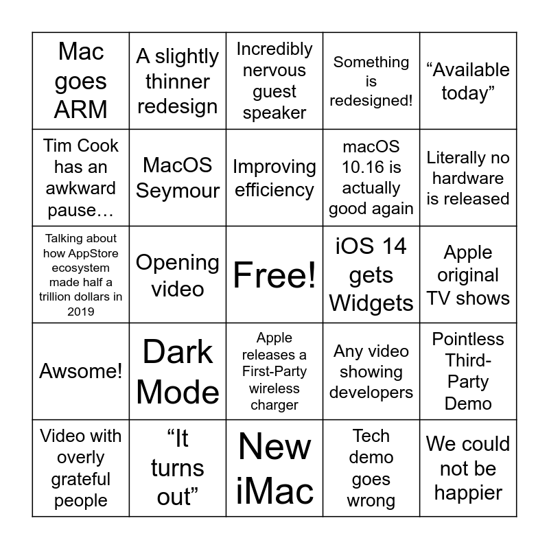 This bingo card has a free space and 102 words: “We think you`re gonna really love it”, Tim Cook pauses for an awkwardly long amount of time, “Available today”, “It`s the best X we`ve ever made.”, Someone goofs up on stage, One more thing …, Pointless Third-Party Demo, Someone FaceTimes Into the Keynote, Craig makes a weed joke, Change the world, Keeping together, Ridiculous “making of” engineering video, In these special days, Connecting people, Apple TV, Mention of anything related to “we love developers”, Awsome!, Gorgeous!, We are so excited, Incredible, Augmented Reality, Retail Stores, Amazing!, …ever!, Apple talks about COVID-19, Literally no hardware is released, Something is redesigned!, Dark Mode, We think you`ll love it!, Bringing friends together, A slightly thinner redesign, Incredibly nervous guest speaker, Tim Cook uses his Apple Watch during a demo, Deirdre O`Brien (new retail person) comes on stage, Awesome reveal video, Apple releases a First-Party wireless charger, Apple uses Neomorphism, 99% Customer Satisfaction, Talking about how AppStore ecosystem made half a trillion dollars in 2019, Tech demo goes wrong, Awkward, People with protective masks, Video with overly grateful people, Strange welcoming gesture, “Our best x ever”, Someone wears another terrible outfit, CarKey, macOS 10.16 is actually good again, Apple releases random products before the event, HomePod Mini, Over-Ear AirPods, Someone claims to have invented something when they really didn`t, Tim Cook has an awkward pause…, Something else is added to iCloud, yet again taking up the precious 5 GB, macOS Messages is finally fixed!, Overdramatic opening video, AirTags Released, Pro Apps on iPad, Overdramatic video about Covid-19, We could not be happier, Groundbreaking, Xcode, X Billions paid to developers, New MacBooks, Lies about how good battery life is, Mentioning how nationality-diverse the crowd of developers is, “We can`t wait to see what you do with it”, Apple original TV shows, Opening video, “It turns out”, “Available later this year”, “This year, we`re taking it to the next level!”, No hardware updates, Good Morning, Tim folding his hands like he`s praying, Any video showing how developers enrich lives, MacOS Seymour, App Store, iOS 14, Apple`s Crack Marketing Team takes a trip, A demo fails, New Wallpaper Management, Apple releases something that wasn`t in the rumors, iOS 14 gets Widgets, Swift, Improving efficiency, Free, Bringing family together, New SF Symbols, “Revolutionary”, Apple Glass, Any video showing developers, We are not standing still, Celebrities on stage, “Let me show it to you”, New iMac, Mac goes ARM, List View, Pointless Third-Party Demo, New Apple TV, AirPower is mentioned and Apple Game Controller.